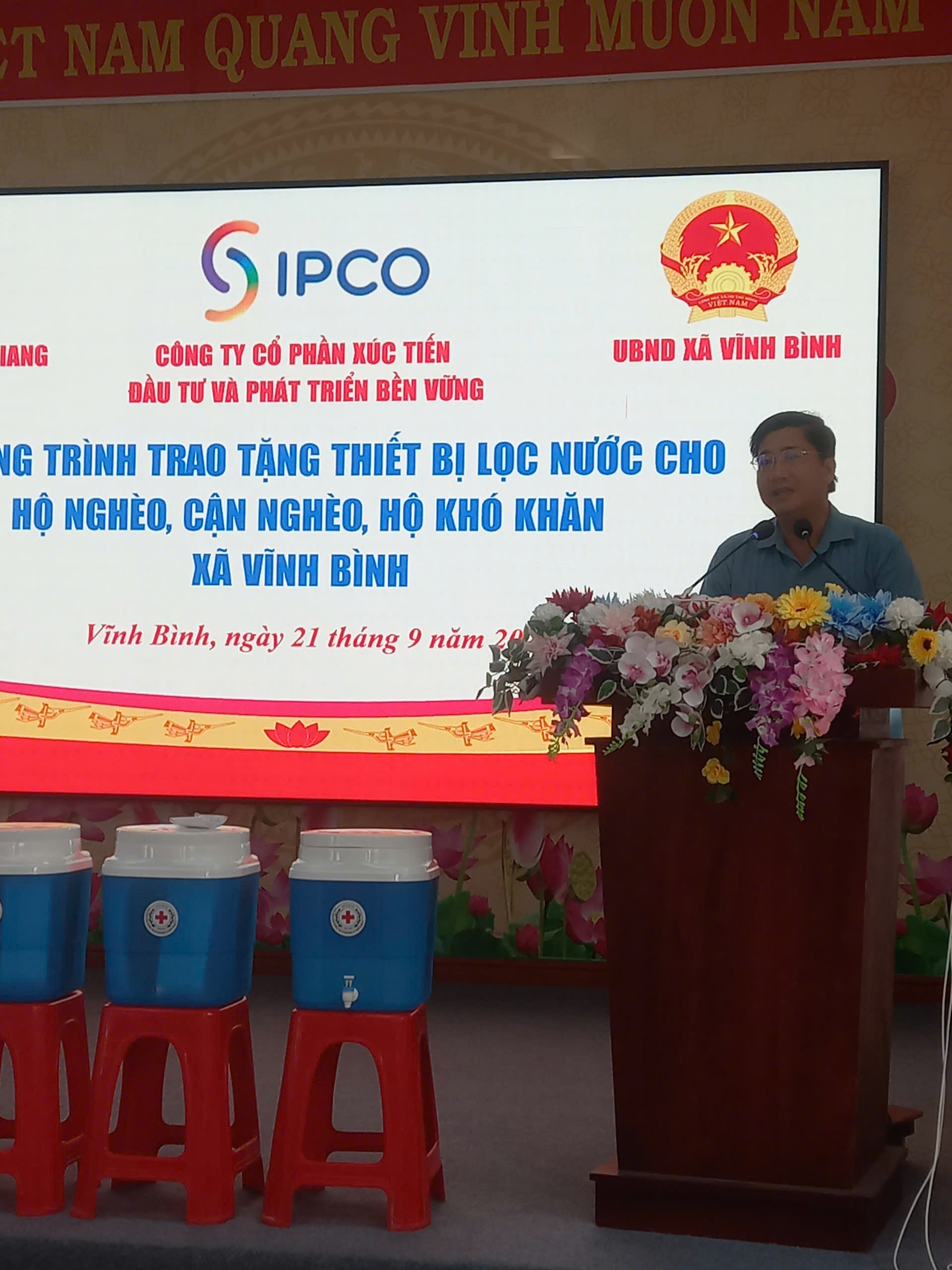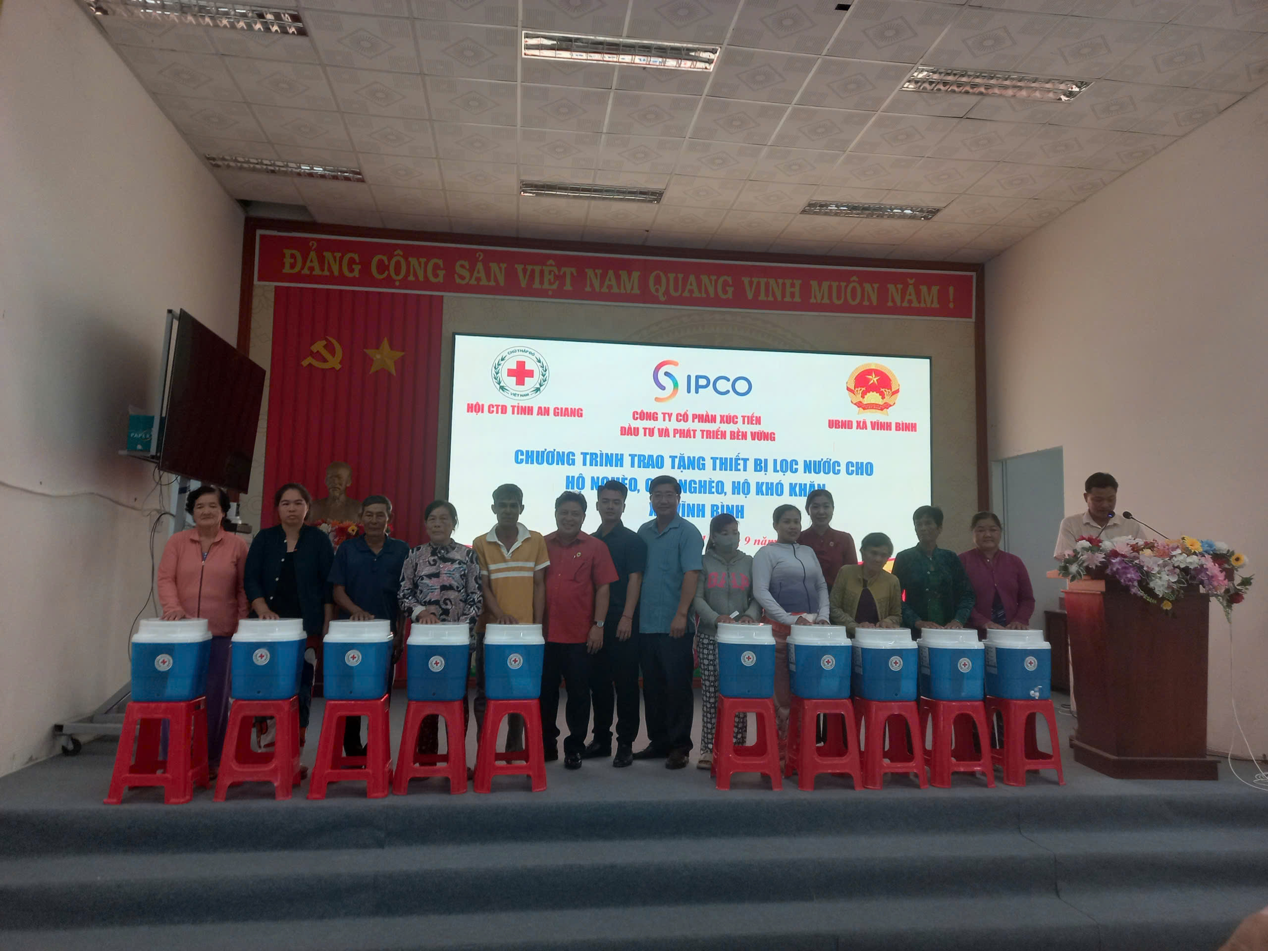 Trong thời gian qua, mặc dù còn nhiều khó khăn, nhưng với sự quan tâm, hỗ trợ của các cấp, các ngành và đặc biệt là sự đồng hành của các nhà hảo tâm, xã ta đã có thêm nhiều chương trình an sinh xã hội ý nghĩa, góp phần giúp các hộ nghèo, hộ khó khăn vươn lên trong cuộc sống. UBND xã Vĩnh Bình đã vận động nhà tài trợ hỗ trợ hỗ trợ thiết bị lọc nước cho bà con nhân dân có hoàn cảnh khó khăn trên địa bàn xã. Ngày 21/9/2025 UBND xã phối hợp cùng Hội chữ Thập đỏ tỉnh, Công ty xúc tiến đầu tư và phát triển bền vững hỗ trợ tặng 200 thiết bị lọc nước nước trị giá 900.000đ/1 thiết bị lọc nước cho bà con hộ nghèo, cận nghèo, hộ khó khăn trên địa bàn xã. Đến dự buổi trao tặng có đồng chí Lưu Kim Quai, UVT trung ương Hội chữ Thập đỏ tỉnh An Giang; Đại diện Công ty xúc tiến đầu tư và phát triển bền vững ông Nguyễn Duy Lộc, Cán bộ công ty; Đaih diện Chính quyền cấp xã Đồng chí Võ Thanh Xuân, Phó bí thư Thường trực đảng ủy, Chủ tịch HĐND xã, cùng các đồng chí lãnh đạo các phòng chuyên môn xã. Tại buổi trao tặng đông chí Võ Thanh Xuân, Phó bí thư Thường trực Đảng ủy-Chủ tịch HĐND xã thay mặt chính quyền địa phương, cảm ơn Hội chữ Thập đỏ tỉnh, Công ty xúc tiến đầu tư và phát triển bền vững đã đồng hành hỗ trợ bà con nhân dân xã Vĩnh Bình được 200 thiết bị lọc nước, góp phần cung cấp nước sách cho bà con vùng khó khăn, tại buổi trao tặng đồng chí cũng rất mong Hội chữ Thập đỏ và Công ty xúc tiến đầu tư và phát triển bền vững tiếp tục hỗ trợ bà con trong thời gian tới.