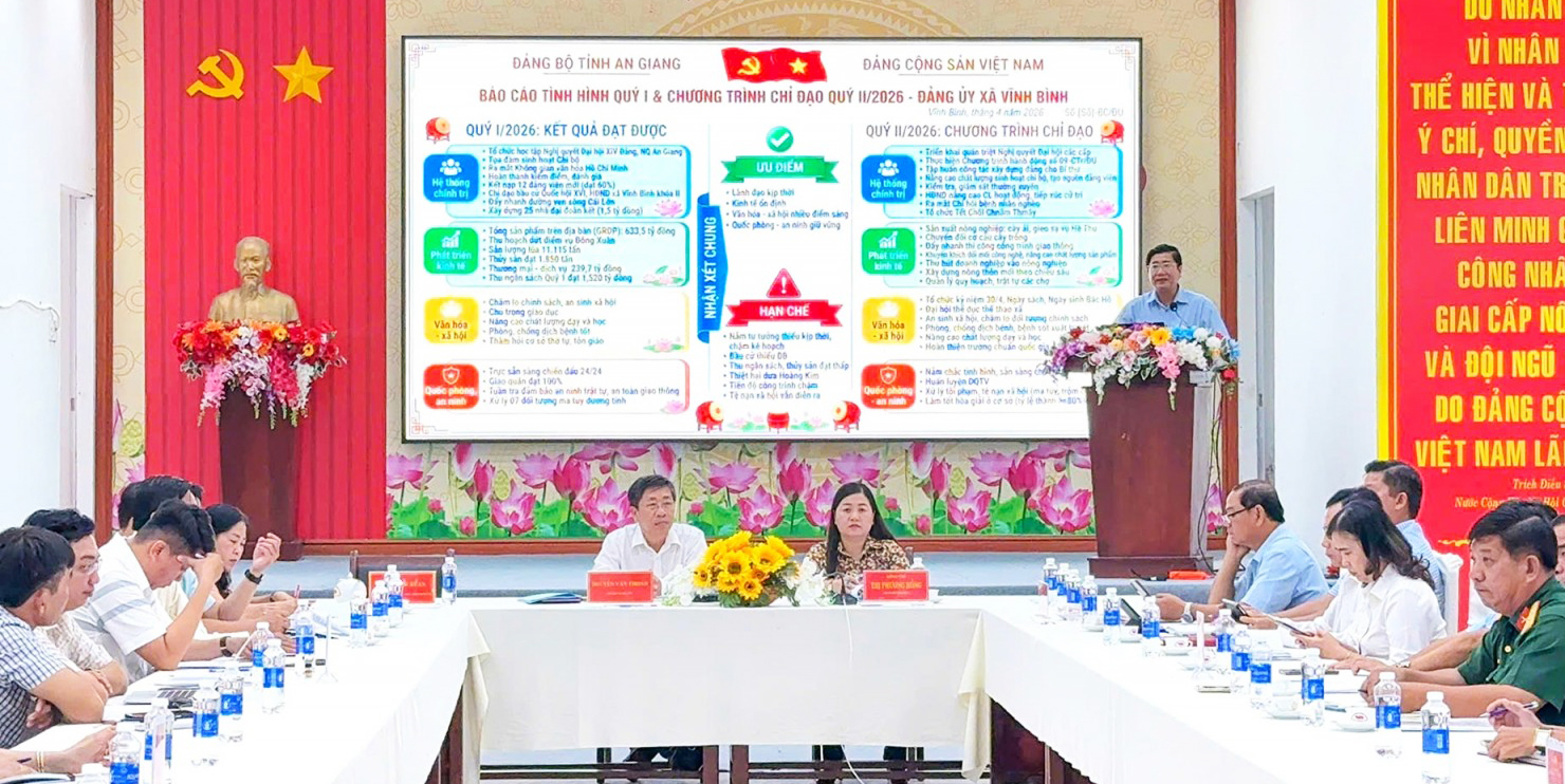 Quý I/2026, Đảng ủy xã Vĩnh Bình đã tập trung lãnh đạo, chỉ đạo thực hiện đạt nhiều kết quả quan trọng, khá toàn diện trên các lĩnh vực. Công tác xây dựng, chỉnh đốn Đảng và hệ thống chính trị được triển khai kịp thời. Hoạt động của cấp ủy, chi, đảng bộ trực thuộc duy trì nền nếp.
