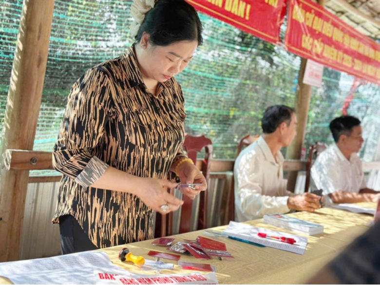 Sau khi bỏ phiếu, cử tri di chuyển đến bàn đóng dấu đã bỏ phiếu và ra về bằng cổng ra (khác với lối vào), bảo đảm quy trình một chiều, đúng trật tự. Trong ảnh là Phó Bí thư Thường trực Đảng uỷ, Chủ tịch HĐND xã Vĩnh Bình Võ Thanh Xuân kiểm tra con dấu, mực đóng dấu và hướng dẫn cho thành viên tổ bỏ phiếu cách đóng dấu vào thẻ cử tri.