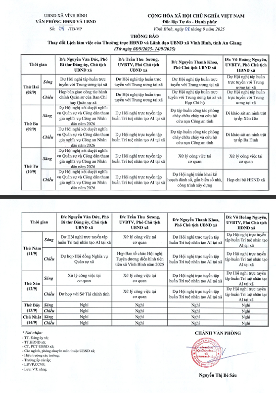 aA CÔNG KHAI DÂN CHỦ LỊCH LÀM VIỆC TUẦN CỦA THƯỜNG TRỰC HĐND VÀ UBND XÃ 10/09/2025, 10:01 LỊCH LÀM VIỆC TUẦN THƯỜNG TRỰC HĐND VÀ LÃNH ĐẠO UBND XÃTập tin đính kèm:08-TB-UBND_0001.pdf Quay về Chia sẻ Z Copy link thành công Tin khác THÔNG BÁO CÔNG KHAI DÂN CHỦ 30/10/2025 THÔNG BÁOĐường dây nóng tiếp nhận thông tin phản ánh về buôn lậu, gian lận thương mại và hàng giả xã Vĩnh Bình  THÔNG TIN LÃNH ĐẠO CÔNG KHAI DÂN CHỦ 04/09/2025 tin test CÔNG KHAI DÂN CHỦ 04/09/2025 bắt quả tang đối tượng tàng trữ trái phép chất ma túy CÔNG KHAI DÂN CHỦ 19/12/2024 Cử tri xã Bình Minh: Nô nức đi bầu cử Trưởng ấp và Tổ trưởng , Tô rphos, Thư ký Tổ NDTQ CÔNG KHAI DÂN CHỦ 10/10/2024 Đối thoại chính sách về giảm nghèo bền vững tại xã Bình Minh, huyện Vĩnh Thuận CÔNG KHAI DÂN CHỦ 17/09/2023 HỘI NGHỊ XÉT DUYỆT CHO CÔNG DÂN SẴN SÀNG NHẬP NGŨ NĂM 2024. CÔNG KHAI DÂN CHỦ 09/09/2023 HỘI NGHỊ XÉT DUYỆT CHO CÔNG DÂN SẴN SÀNG NHẬP NGŨ NĂM 2024. CÔNG KHAI DÂN CHỦ 09/09/2023        Ngày 07-8/9/2023 tại Hội trường UBND xã. Hội đồng nghĩa vụ quân sự xã Bình Minh, Vĩnh Thuận, Kiên Giang tổ chức hội nghị xét duyệt cho công dân sẵn sàng nhận ngũ năm 2024.        TẤM GƯƠNG VƯỢT KHÓ THOÁT NGHÈO TẠI XÃ BÌNH MINH CÔNG KHAI DÂN CHỦ 02/08/2023 Chương trình “Sẻ chia – Kết nối yêu thương” trao quà, khám bệnh và cấp phát thuốc miễn phí cho các hộ gia đình nghèo, cận nghèo trên địa bàn xã tại xã bình minh. CÔNG KHAI DÂN CHỦ 30/07/2023 /lich-lam-viec-tuan-cua-thuong-truc-hdnd-va-ubnd-xa