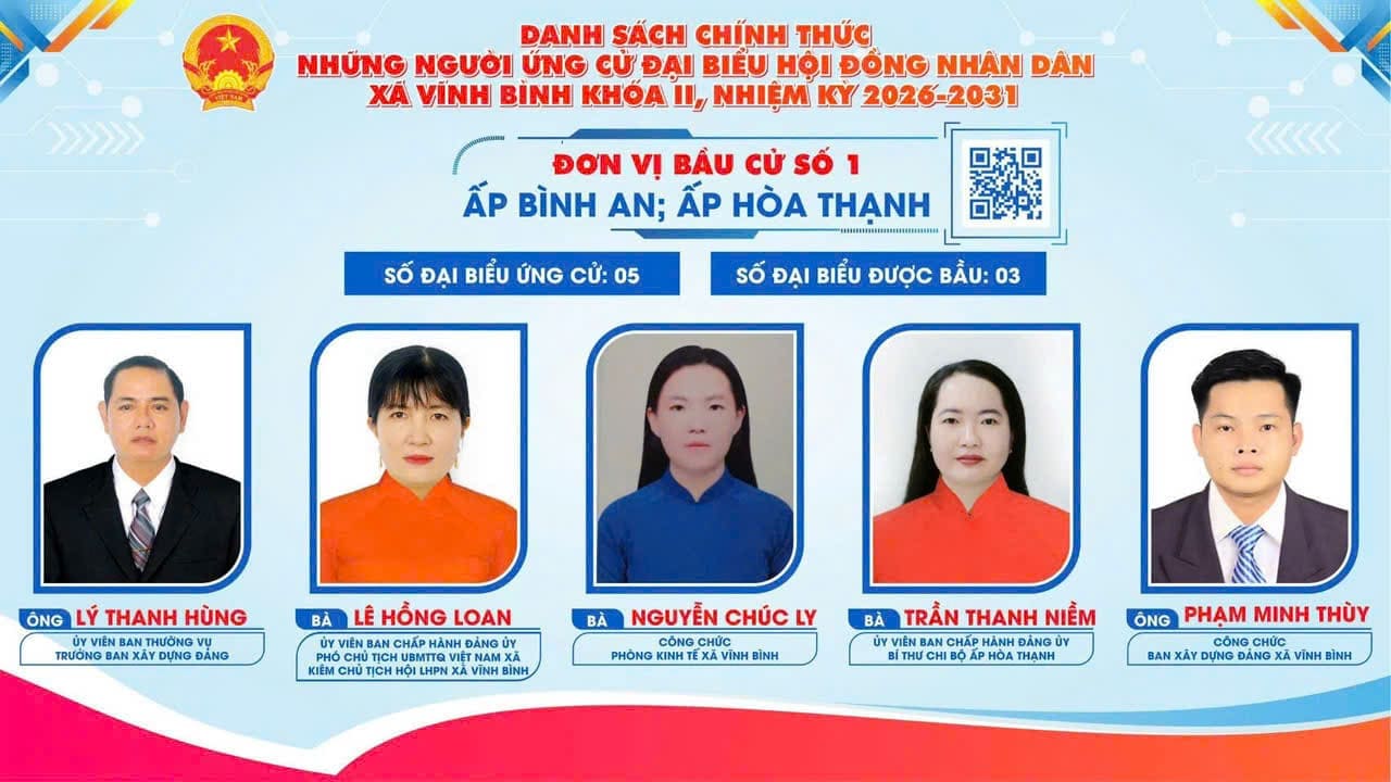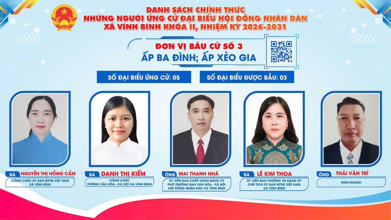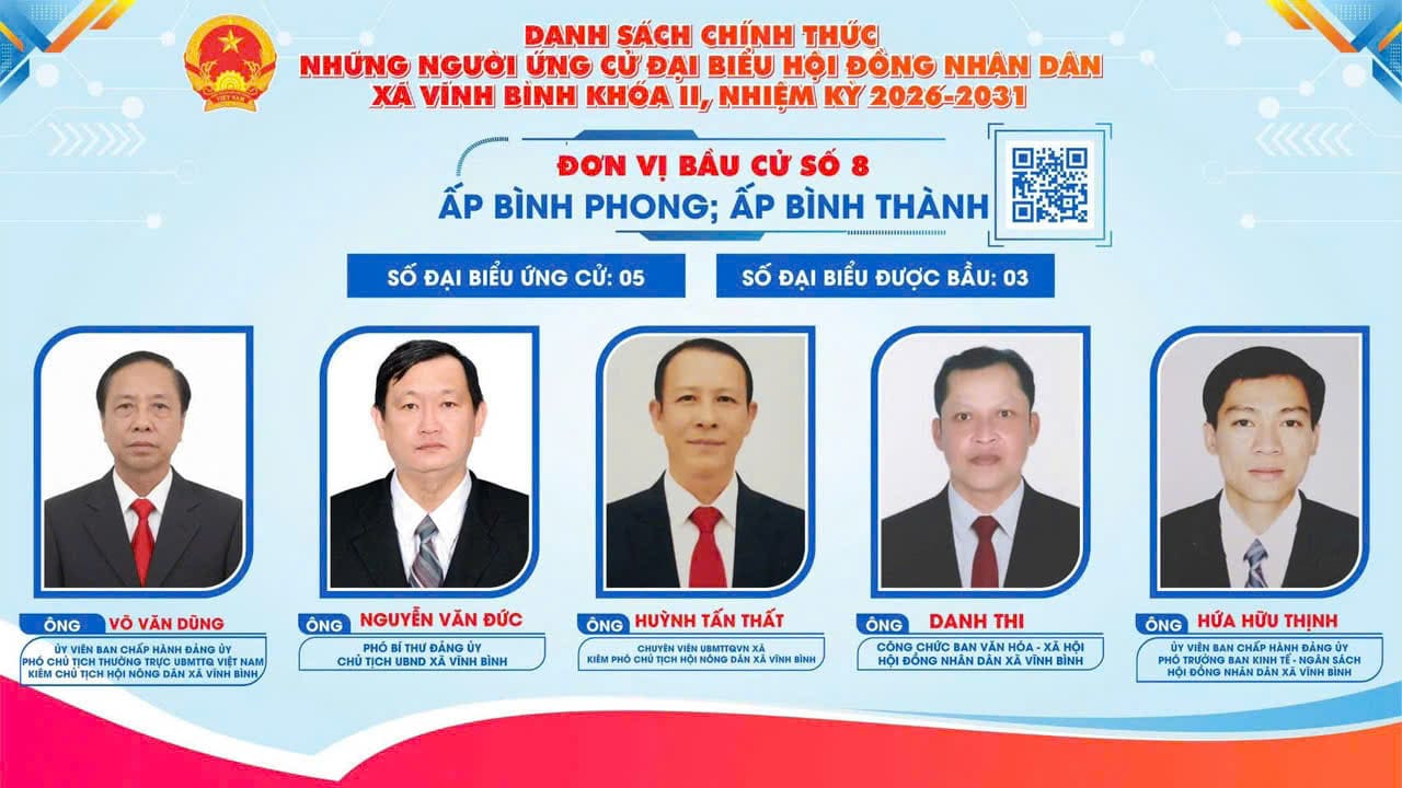 Ngày 17 tháng 02 năm 2026 căn cứ Biên bản Hiệp thương lần ba của UB MTTQ VN xã, Ủy ban Bầu cử xã Vĩnh Bình ban hành Nghị quyết số 03/NQQ-UBBC ngày 17/02/2026 của Ủy ban bầu cử xã về việc Công bố danh sách chính thức những người ứng cử đại biểu Hội đồng nhân dân xã Vĩnh Bình khóa II, nhiệm kỳ 2026 – 2031 theo từng đơn vị bầu cử trên địa bàn xã.
