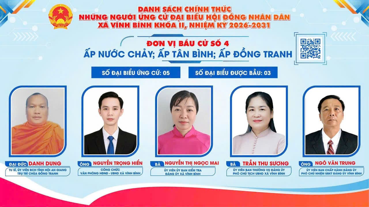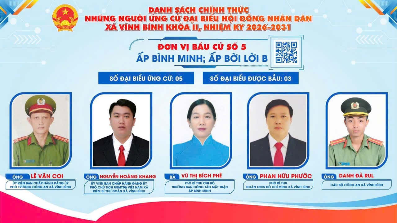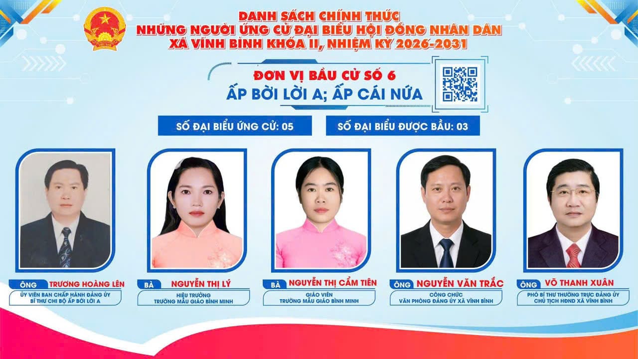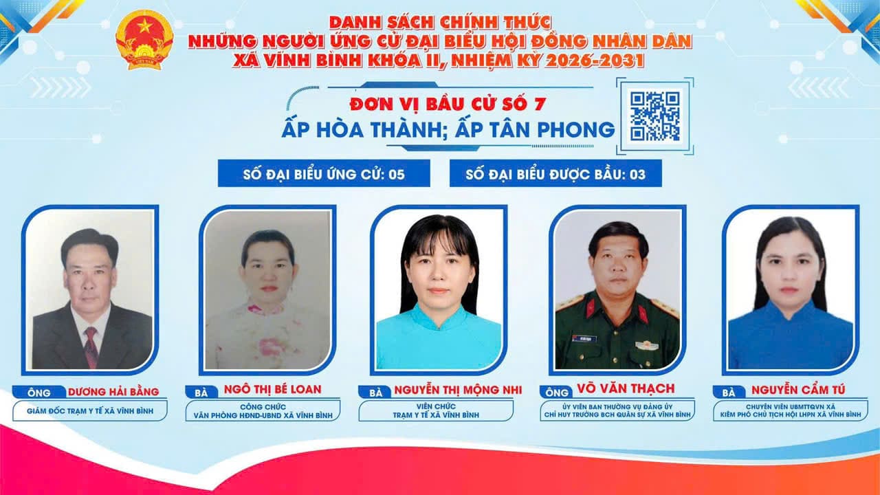 Ngày 17 tháng 02 năm 2026 căn cứ Biên bản Hiệp thương lần ba của UB MTTQ VN xã, Ủy ban Bầu cử xã Vĩnh Bình ban hành Nghị quyết số 03/NQQ-UBBC ngày 17/02/2026 của Ủy ban bầu cử xã về việc Công bố danh sách chính thức những người ứng cử đại biểu Hội đồng nhân dân xã Vĩnh Bình khóa II, nhiệm kỳ 2026 – 2031 theo từng đơn vị bầu cử trên địa bàn xã.