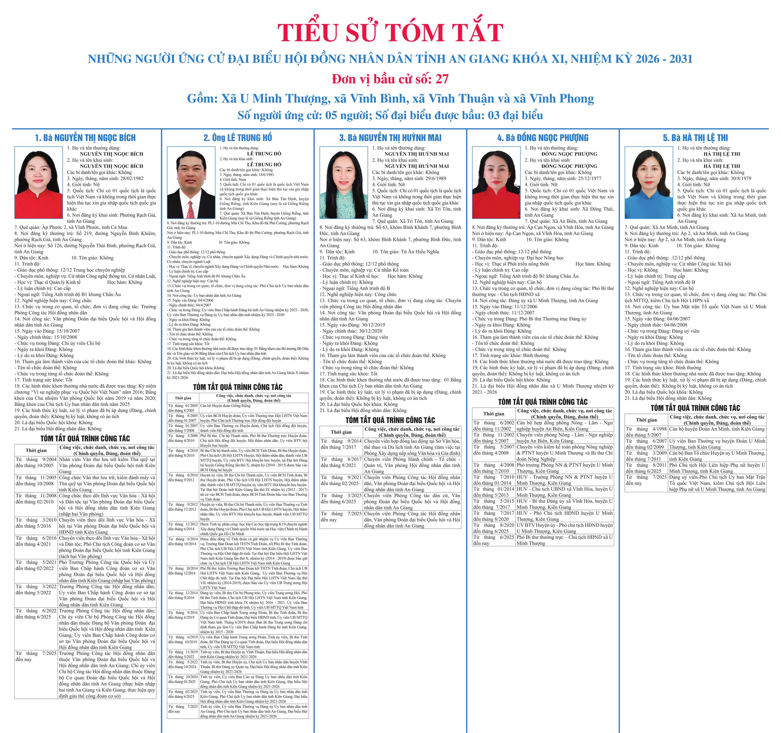 Đại diện Ủy ban MTTQ Việt Nam xã Vĩnh Bình đã thông qua tiểu sử tóm tắt của các ứng cử viên đại biểu HĐND tỉnh khóa XI tại đơn vị bầu cử số 27 gồm: ông Lê Trung Hồ - Tỉnh ủy viên, Phó Chủ tịch UBND tỉnh An Giang; bà Nguyễn Thị Ngọc Bích - Trưởng phòng Công tác HĐND, Văn phòng ĐBQH và HĐND tỉnh; bà Nguyễn Thị Huỳnh Mai - Công chức Phòng Công tác HĐND, Văn phòng ĐBQH và HĐND tỉnh; bà Đồng Ngọc Phượng - Phó Bí thư Thường trực Đảng ủy, Chủ tịch HĐND xã U Minh Thượng; bà Hà Thị Lệ Thi - Phó Chủ tịch Ủy ban MTTQ Việt Nam xã, Chủ tịch Hội Liên hiệp Phụ nữ xã U Minh Thượng.