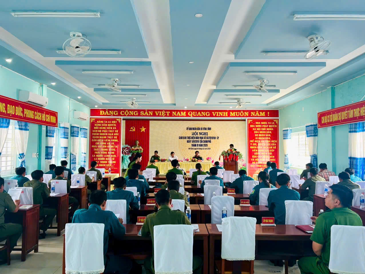 Ngày 04 tháng 02 năm 2026, tại Hội trường Ban CHQS xã Vĩnh Bình, Ban CHQS phối hợp với Công an Tham mưu cho UBND xã tổ chức hội nghị giao ban thực hiên nghị định 02, 03 của Thủ tướng Chính phủ đánh giá kết quả công tác phối hợp thực hiện nhiệm vụ quốc phòng – an ninh trên địa bàn. Đồng chí Nguyễn Văn Đức, Phó Bí thư Đảng ủy, Chủ tịch UBND xã dự, chỉ đạo và chủ trì hội nghị.